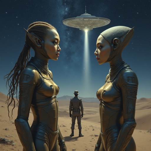 Al llegar junto a ella, me extendió la mano y me habló en un idioma extraño, musical y melodioso. No entendí sus palabras, pero sí supe por su gesto que me invitaba a entrar a la nave. Con un leve temblor, caminé a su lado y subimos la escalerilla. Traspasamos la compuerta. Una vez en el interior, quedé maravillado: el OVNI mostraba una estructura metálica brillante, con paredes curvas y un tablero lleno de luces y palancas. La mujer me indicó un asiento frente a una especie de ventanal. Desde allí podía contemplar todo el panorama de Talara iluminada.